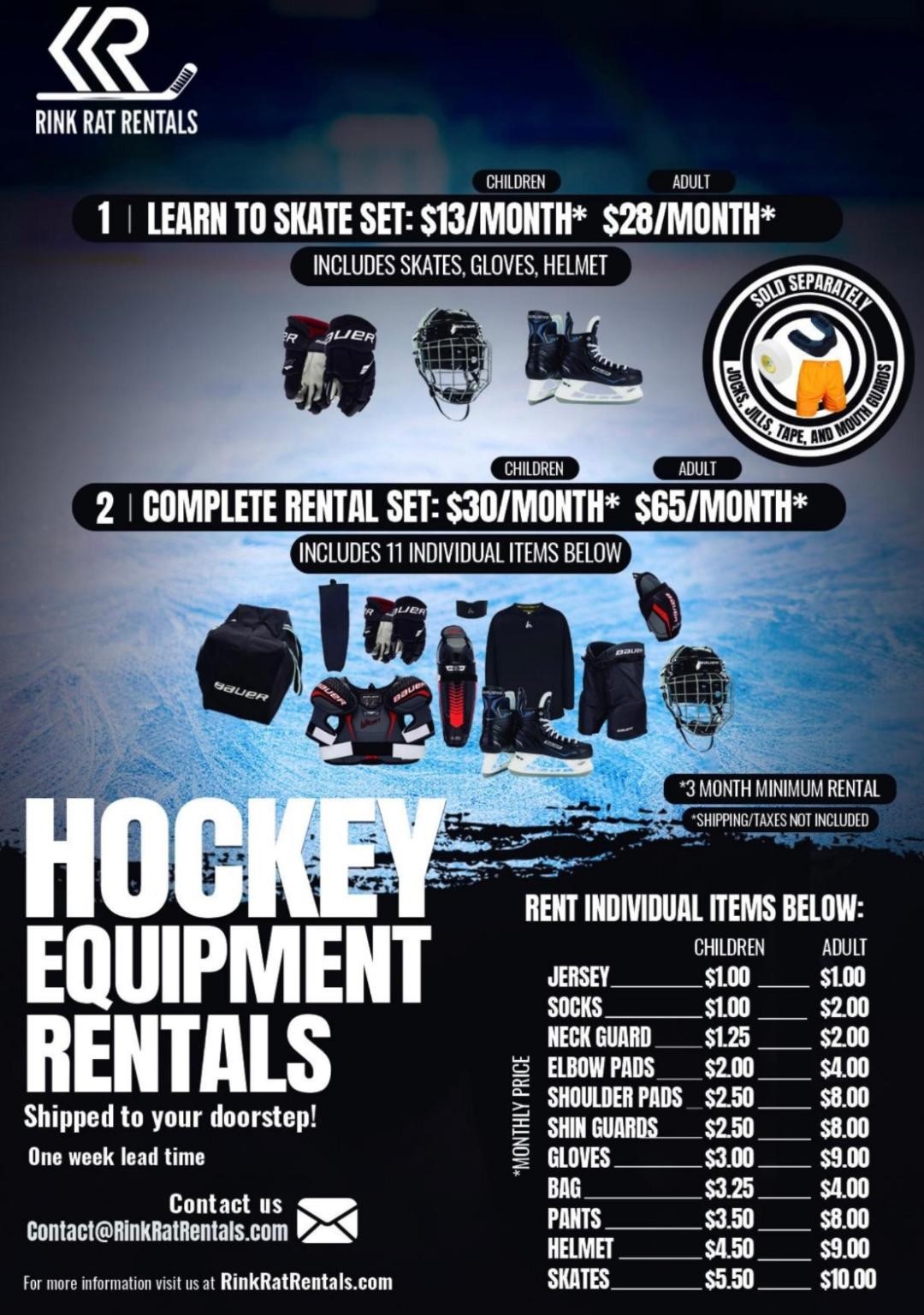 For any questions, you can reach them at contact@rinkratrentals.com. We have attached their flyer for more information. We proudly support Rink Rat Rentals and their initiative to provide affordable options for hockey equipment to our community.